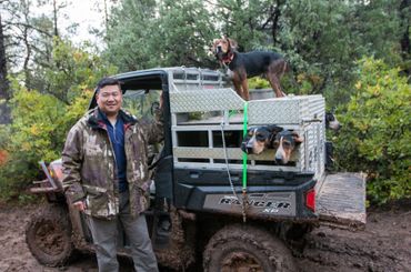Our Lion hunt begins by driving roads checking for tracks in the early morning hours before sunrise. We usually have 3 to 5 4x4 trucks checking roads, so it typically doesn't take long to find a track. Once a track is located the hounds are released after sunrise. If you've never experienced this, then you are in for an extreme adrenaline rush. There is nothing like the enthusiasm and excitement that comes from a well trained pack of Lion hounds trailing a lion. We then follow the hounds until they tree or hold the lion at bay. Once at the tree, you will have the opportunity to harvest one of the most elusive predators of North America.